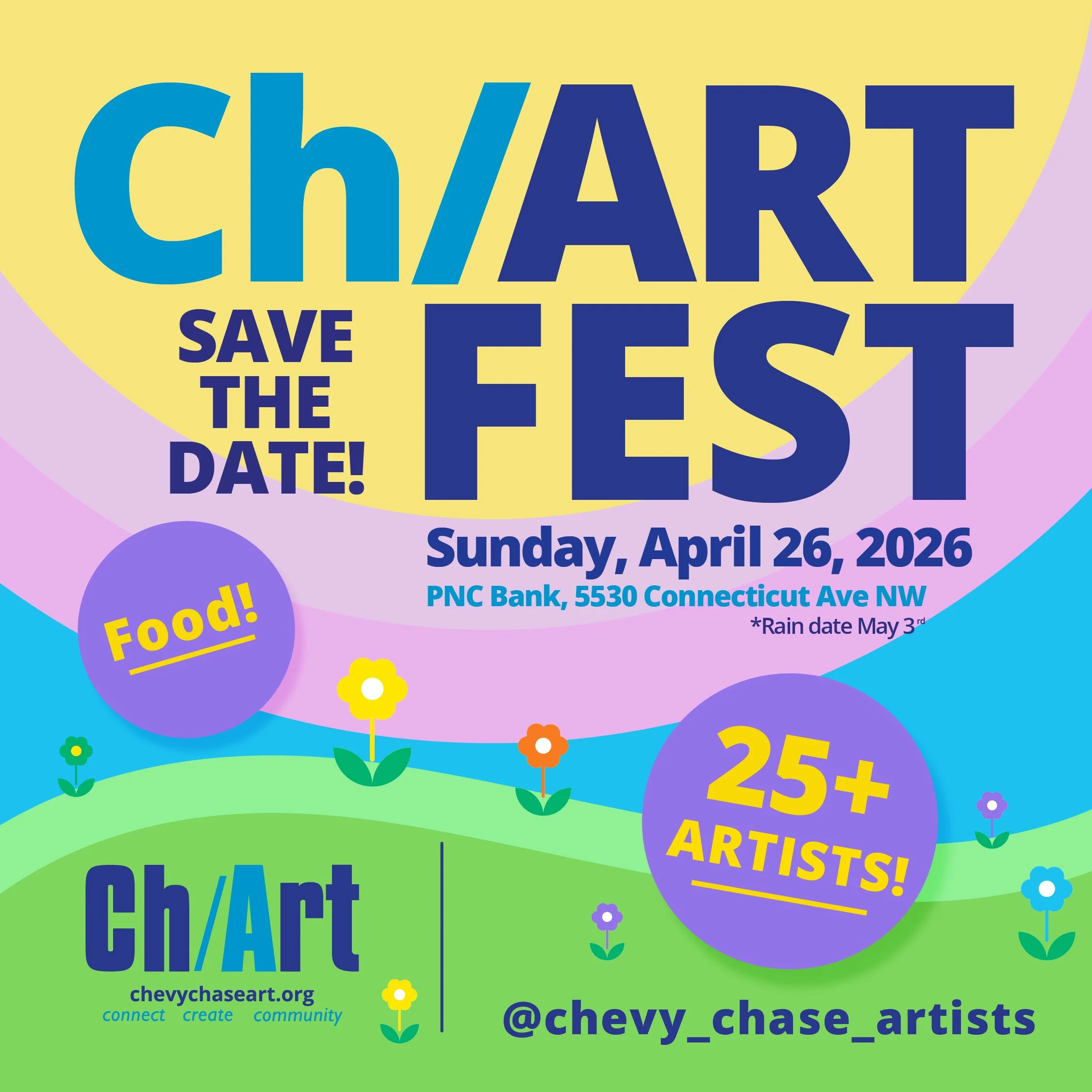 We are delighted to announce that Ch/Art’s annual spring Ch/Art Fest will be held on Sunday, April 26, 2026 from 11 a.m. to 4 p.m. at the parking lot of the PNC Bank, 5530 Connecticut Avenue, N.W., Washington, D.C. The rain date is Sunday, May 3. There will be a fee of $25 to participate in the show. Participation is open on a first-come, first-serve basis to all Ch/Art members who have paid their dues for 2026. Twenty-six 10 x 10 spaces are available. Participants can share a space.