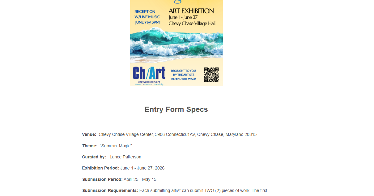 We are excited to announce Ch/Art’s second Summer Magic show at the Chevy Chase Village Hall, opening June 1 and running through June 27. Participation is open to all Ch/Art members who have paid their dues for 2026 on a first-come, first-serve basis. Each artist is invited to submit two works. The first 70 artists to submit will be featured in the exhibit. Subject to space limitations, the curator may select one or both of the artist's submitted works.